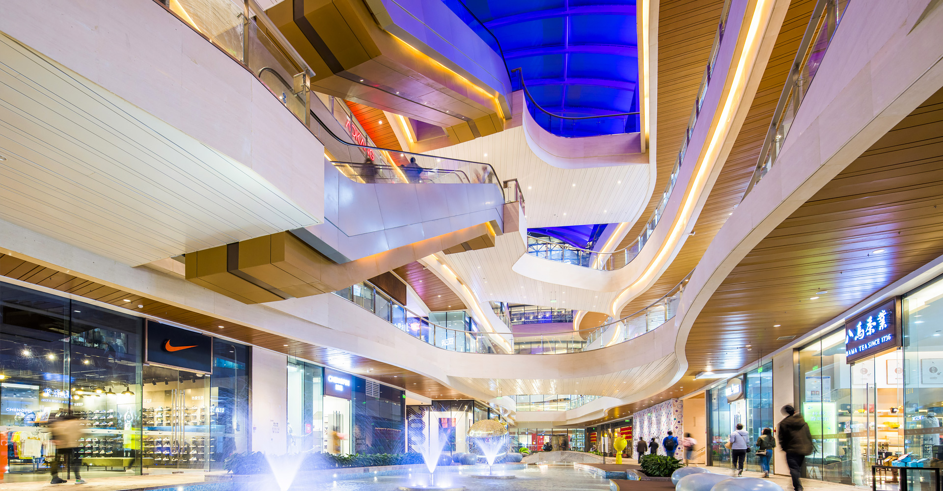 建筑內(nèi)部動線通過室內(nèi)室外兩條商業(yè)街創(chuàng)造了豐富的購物體驗,將多種水景,引入室內(nèi)和室外的場所,引導客戶從項目西北角的地鐵入口,直至南側(cè)梅溪湖岸邊。通過精心布局、動線組織、景觀和水景結(jié)合,使覽秀城突破傳統(tǒng)購買中心定義,成為一個綜合濱水體驗中心。