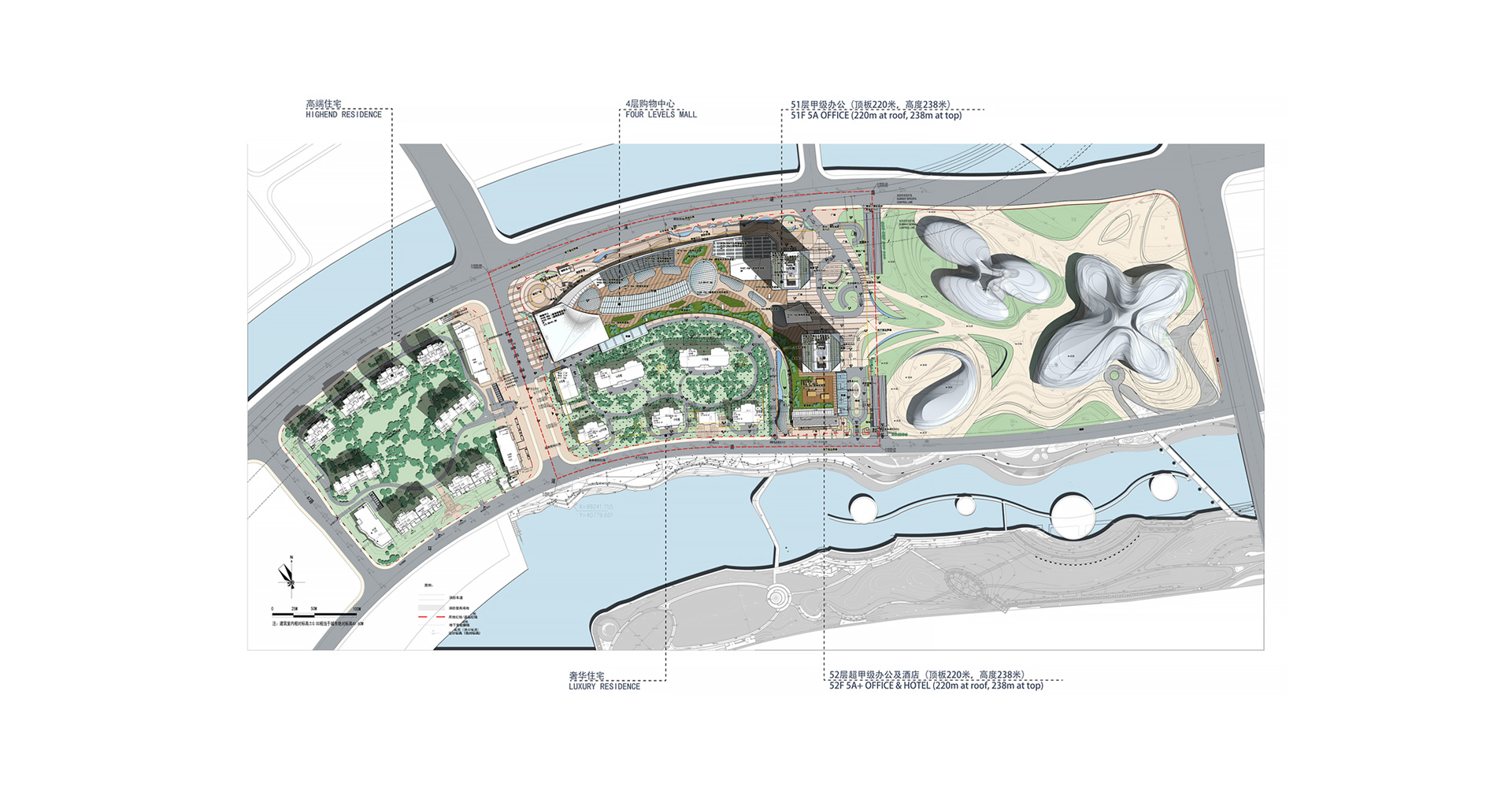 長沙金茂梅溪湖國際廣場項目是金茂集團首個購物中心綜合體項目,是集覽秀城、喜達屋豪華精選(超五星)酒店、綠色豪宅以及高端寫字樓的綜合項目。在設(shè)計中,力求最大限度地集合多種業(yè)態(tài)于一體,充分利用地塊的景觀資源優(yōu)勢進行規(guī)劃布局,注重建筑與場所的關(guān)系,各功能體之間相互借勢,共同提升價值。從湖中及沿湖景觀帶上均有非常好的觀賞角度,項目的形象極為突出,在塑造濱水城市形象方面有重要的作用。