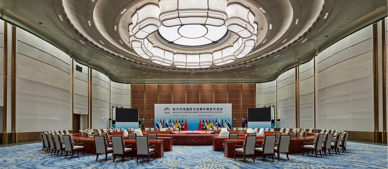 本項目改造設(shè)計范圍作為國家級重要會議的主會場、主宴會廳及附屬空間,順利承辦2017年金磚國家領(lǐng)導人第九次會晤及相關(guān)其他會議。