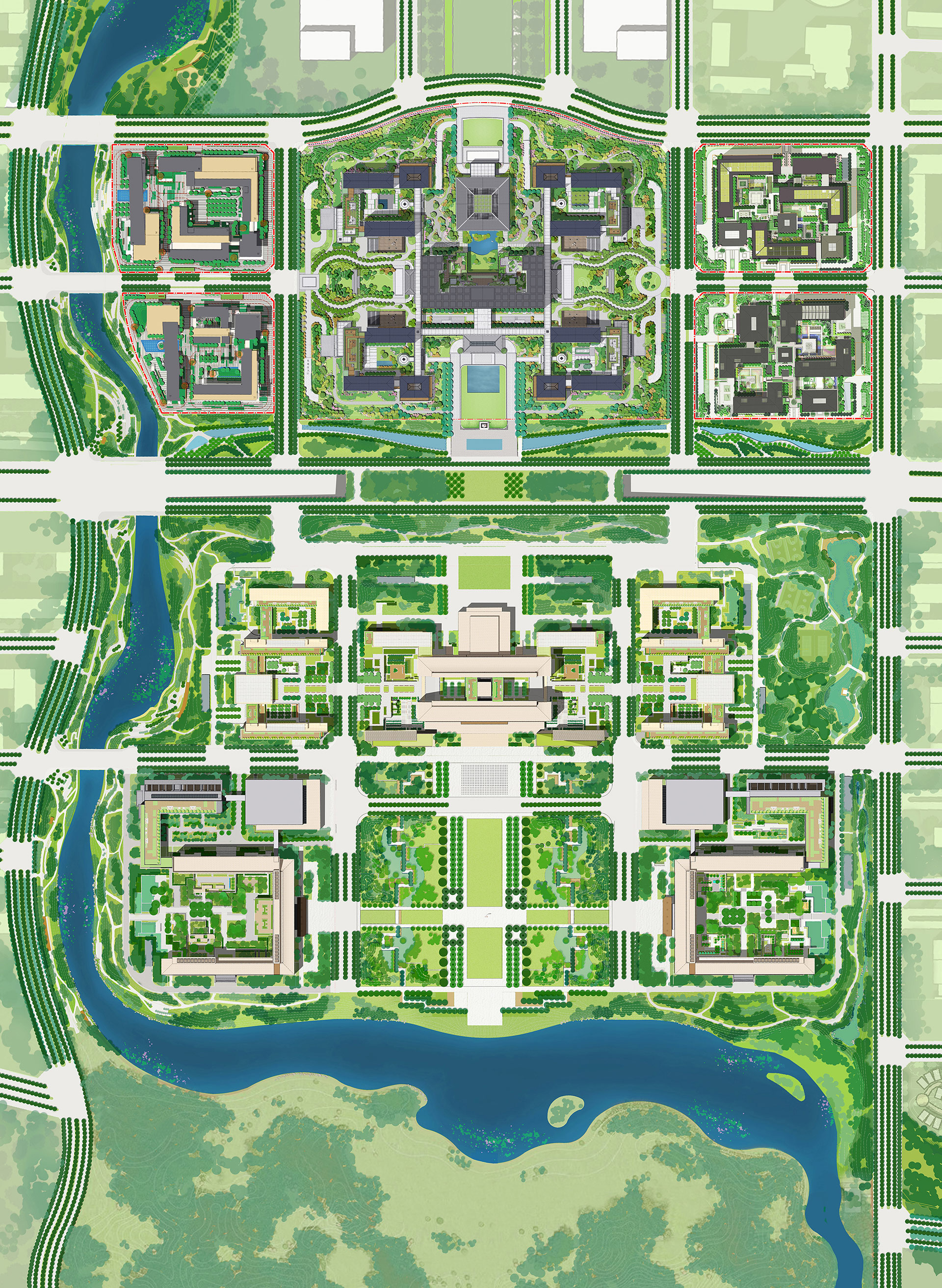 規(guī)劃設(shè)計遵循對稱格局、院落布局、山水環(huán)繞、中國建筑的設(shè)計思想,深化開展并實(shí)施落實(shí)