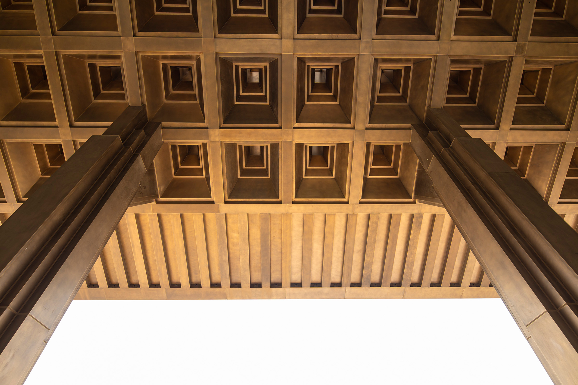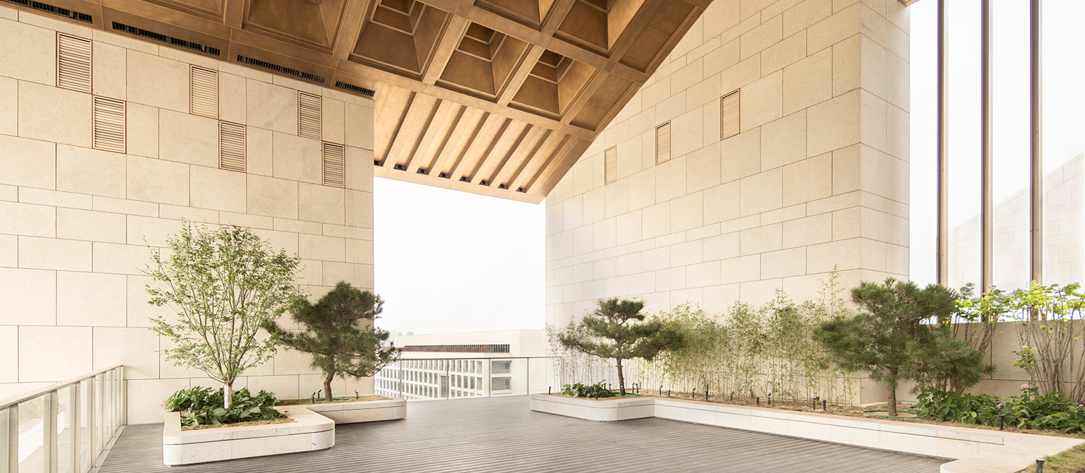 新中式坡屋面與周圍自然環(huán)境融合,石材幕墻厚重典雅,簡樸莊重,檐口下的吊頂部分采用藻井式處理營造出中國傳統(tǒng)建筑屋檐處的空間氛圍。