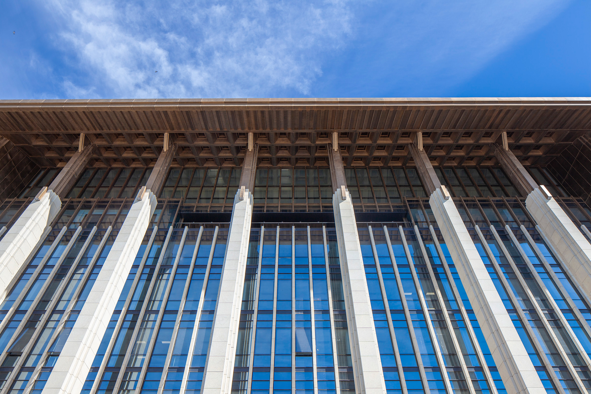 行政辦公區(qū)一期工程—市委組團(tuán)從前期規(guī)劃到單體設(shè)計(jì)積極主動(dòng)地落實(shí)了“創(chuàng)新、協(xié)調(diào)、綠色、開放、共享”的發(fā)展理念。力圖打造能夠滿足當(dāng)代政府需求、展現(xiàn)當(dāng)代政府形象,具有前瞻、經(jīng)濟(jì)、共享、綠色特點(diǎn)的“千年大計(jì)”。項(xiàng)目坐落在行政中心中央,是一組中軸對稱建筑,采用以院落空間為核心的布置方式。各院落空間彼此分隔,又相互聯(lián)系,兼具秩序性和層次感。