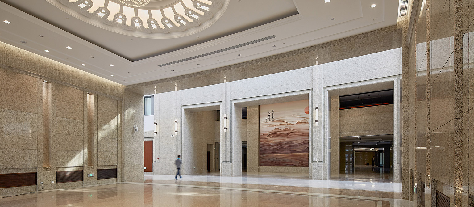 在維持原有建筑形象的同時,進行優(yōu)化設(shè)計,尊重婦聯(lián)歷史和本地段建筑文脈,與周圍環(huán)境協(xié)調(diào),體現(xiàn)沉穩(wěn),莊重,包容,不張揚的理念。布局上因地制宜,將原有主體南側(cè)擴建一禮儀大廳,整個建筑群體近似“工”字形,在東側(cè)圍合為一個東院,為日常人流車流提供回轉(zhuǎn)空間,南部為禮儀性出入口空間緊鄰城市綠化帶。