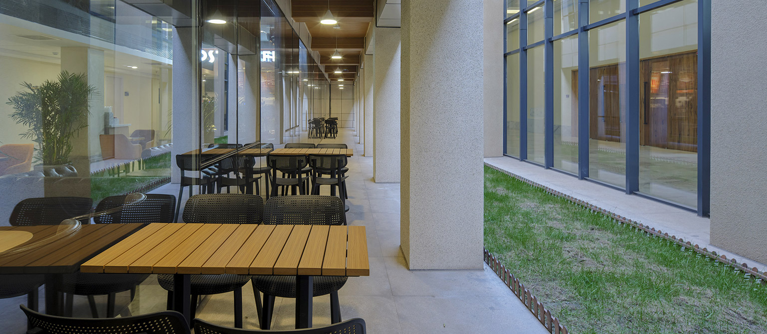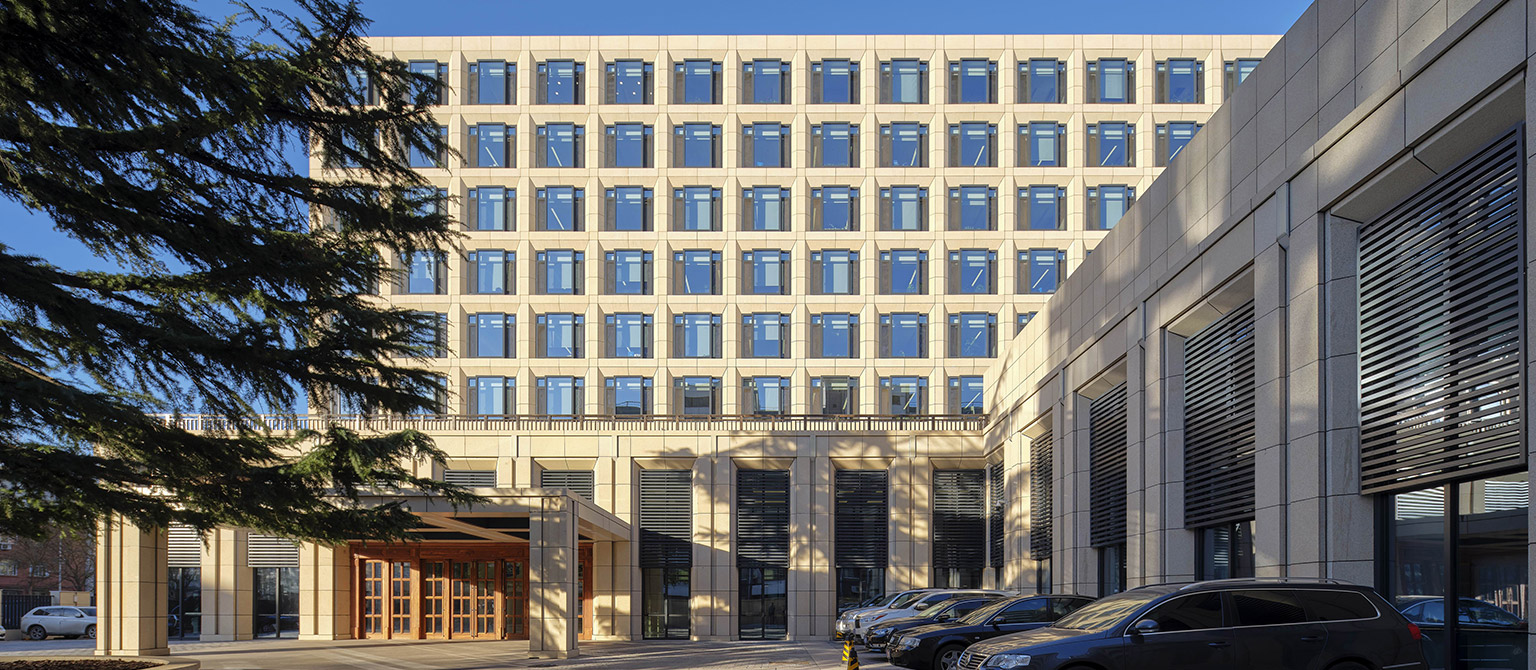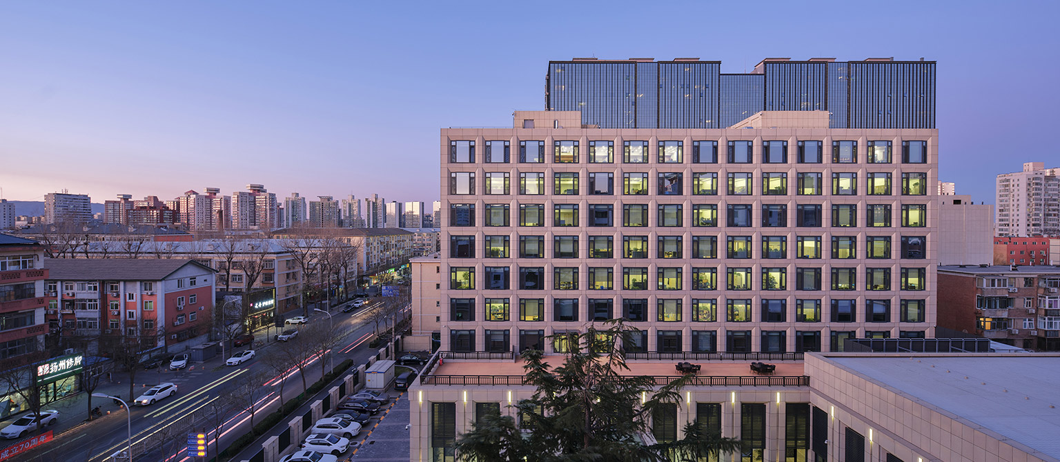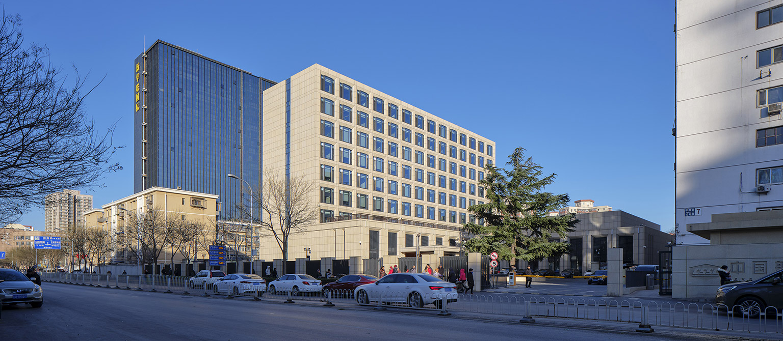 1)拆除重建多功能廳,設(shè)置地下室作為消防水池和泵房等設(shè)備用房;2)主樓南側(cè)新建兩層通高度裙房,與主樓脫開(kāi)兩個(gè)內(nèi)天井,作為人員休息場(chǎng)所。3)注重光影效果,大堂區(qū)域采用兩層通高的落地玻璃幕墻,塑造了明亮通透的室內(nèi)空間形象。4)對(duì)樓電梯、核心筒進(jìn)行改造,更好的適應(yīng)使用功能的需求,并滿足現(xiàn)行規(guī)范的要求。