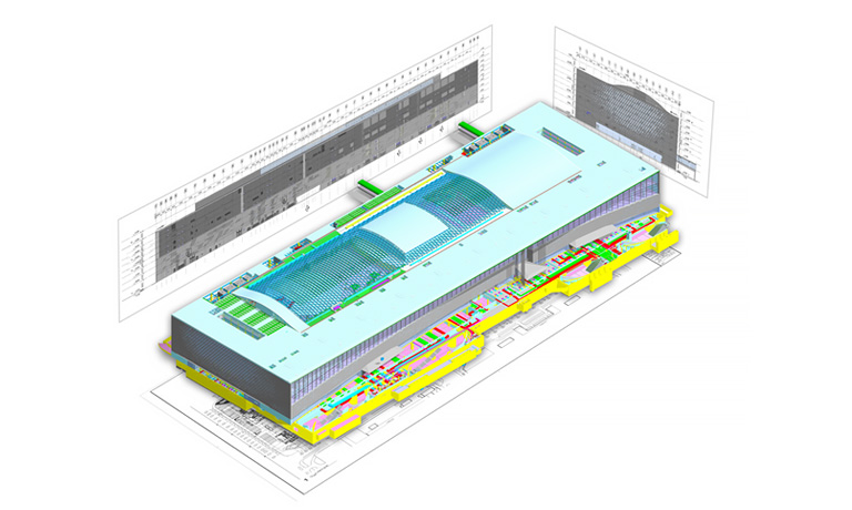 由于獨特的創(chuàng)意構思,鳳凰中心具有復雜的三維形體,將這樣的復雜形體在設計建造中實現(xiàn)具有很高的科技含量。設計團隊通過長達6年的探索與挑戰(zhàn),利用數(shù)字化技術解決了大量前所未有的技術難題。項目在設計深化、加工、建造的全過程開創(chuàng)性的大量運用了三維數(shù)字化技術,形成了一系列科技創(chuàng)新技術:設計團隊利用數(shù)字技術指導全過程設計控制與優(yōu)化。首創(chuàng)性的構建了適用于高精度控制要求的數(shù)字技術平臺,創(chuàng)建高質量建筑信息模型與數(shù)據庫,實現(xiàn)了對所有建筑可視面的優(yōu)化。首創(chuàng)性的構建了建筑幾何控制系統(tǒng),精確解決了當代復雜建筑設計控制中建筑系統(tǒng)之間的定位“拼合”問題。結構設計開啟了復雜形體建筑的新模式,創(chuàng)造性的采用了“雙向疊合網格結構體系”。首創(chuàng)了“彌合自由曲面的單向非連續(xù)折板幕墻體系”。用平板幕墻彌合大曲率自由曲面。并在加工生產全過程實現(xiàn)了與數(shù)字化設計控制的無縫對接。