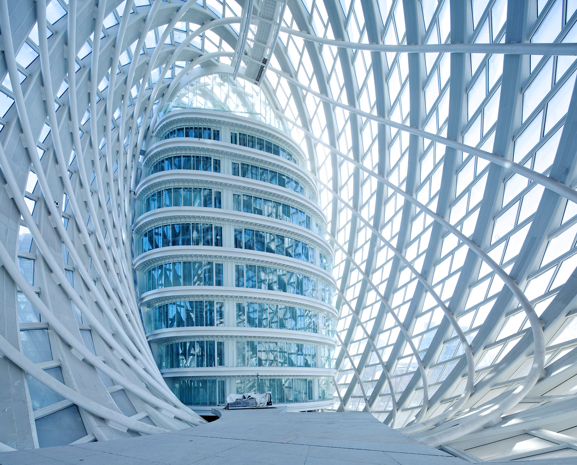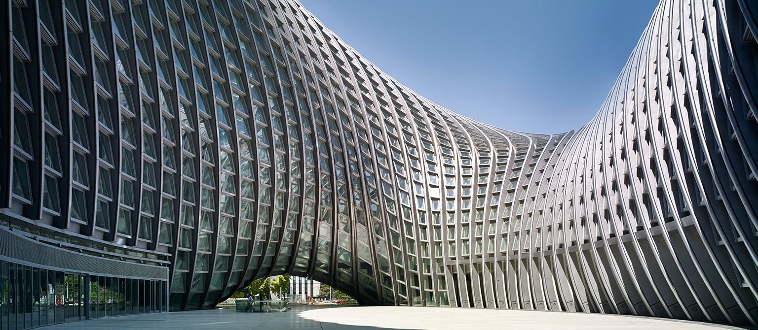 此外,整個建筑也體現(xiàn)了對綠色節(jié)能和低碳環(huán)保的設計理念。光滑外形沒有設一根雨水管,所有在表皮形成的雨水順著外表的主肋導向建筑底部連續(xù)的雨水收集池,經過集中過濾處理后提供藝術水景及庭院澆灌。建筑具有單純柔和的外殼,除了其自身的美學價值之外,也有緩和北京冬季強烈的高層建筑的街道風效應的作用。建筑外殼同時又是一件“綠色外衣”,它為功能空間提供了氣候緩沖空間。建筑的雙層外皮很好地提高功能區(qū)的舒適度和建筑能耗。設計利用數(shù)字技術對外殼和實體功能空間進行量體裁衣,精確地吻合彼此的空間關系。共享空間利用30米的高差的下大上小的煙囪效應,在過渡季中,可以形成良好的自然氣流組織,節(jié)省能耗。