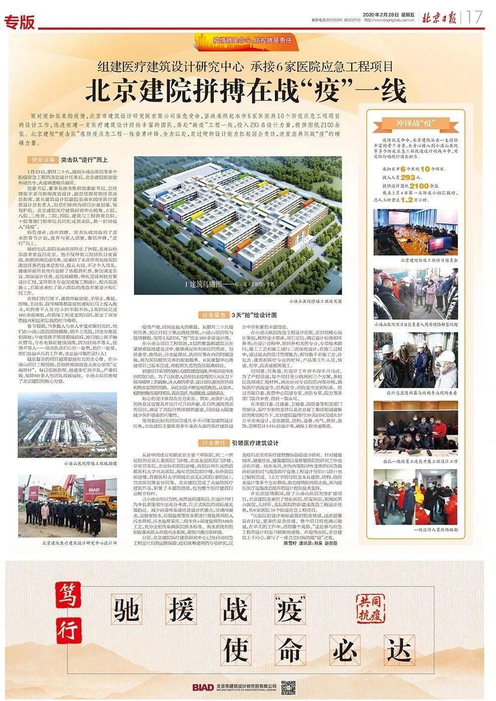 面對(duì)突如其來(lái)的疫情,北京市建筑設(shè)計(jì)研究院股份有限公司臨危受命,堅(jiān)決承擔(dān)起本市6家醫(yī)院共10個(gè)防疫應(yīng)急工程項(xiàng)目的設(shè)計(jì)工作,迅速組建一支醫(yī)療建筑設(shè)計(jì)經(jīng)驗(yàn)豐富的團(tuán)隊(duì),奔赴“戰(zhàn)疫”工程一線,投入293名設(shè)計(jì)力量,提供圖紙2100余張。北京建院“突擊隊(duì)”在防疫應(yīng)急工程一線奮勇沖鋒、全力以赴,用過(guò)硬的設(shè)計(jì)能力扛起國(guó)企責(zé)任,迸發(fā)出共同戰(zhàn)“疫”的磅礴力量。