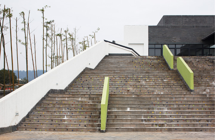 開放的坡道設(shè)計,充分考量了殘障人士的需求,也為其他同學(xué)增添了趣味的空間;相鄰的宿舍減少了陽臺的隔斷,讓溫暖的陽光照進房間去撫慰受傷的心靈,減少了阻隔的陽臺,更是方便了同學(xué)間的溝通交流;校園內(nèi)的主要色調(diào)融入了地域民族文化,將灰白色調(diào)與羌族服飾中的“紅、黃、藍、綠、黑”相交融。在新北川中學(xué)的設(shè)計中,設(shè)計師們用創(chuàng)意磨平了建筑的棱角,校園中充滿著“人情味兒”。