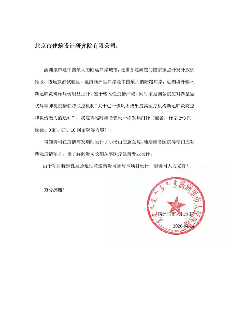 感謝信 | 北京建院支援滿洲里醫(yī)院發(fā)熱門診建設(shè)