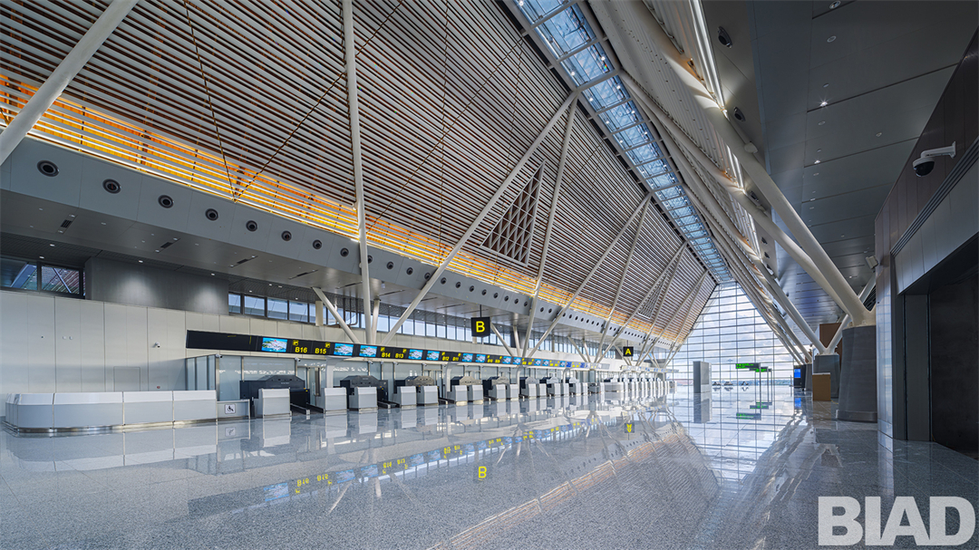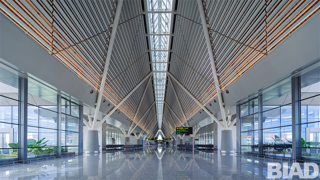 機(jī)場(chǎng)航站樓總面積8.18萬平方米,采用了簡(jiǎn)潔的T字構(gòu)型,未來可向兩側(cè)發(fā)展候機(jī)指廊及機(jī)場(chǎng)附屬設(shè)施,向陸側(cè)發(fā)展臨空開發(fā)項(xiàng)目。作為世界文化遺產(chǎn)-吳哥窟所在城市的門戶機(jī)場(chǎng),設(shè)計(jì)團(tuán)隊(duì)注重吸取傳統(tǒng)精華,在人文、氣候等方面著力體現(xiàn)建筑的地域性。航站樓各功能區(qū)的體量相對(duì)拉開,加大建筑的開敞面,以利通風(fēng)散熱。雙坡屋面、挑檐深遠(yuǎn),以利排水和遮陽(yáng)。建筑采用了模數(shù)化-單元式設(shè)計(jì),以外露的斜撐結(jié)構(gòu)支撐屋面,以三角網(wǎng)格控制造型,以現(xiàn)代建筑語(yǔ)言傳遞“吳哥印象”。
