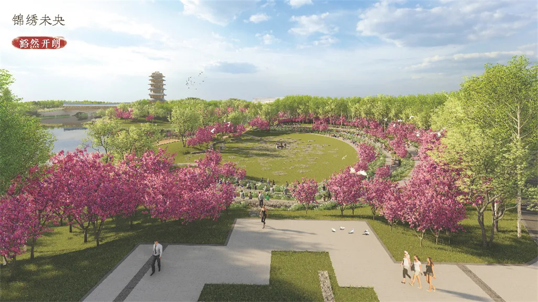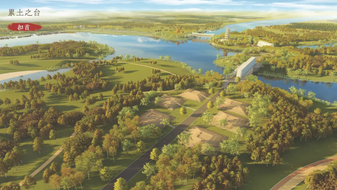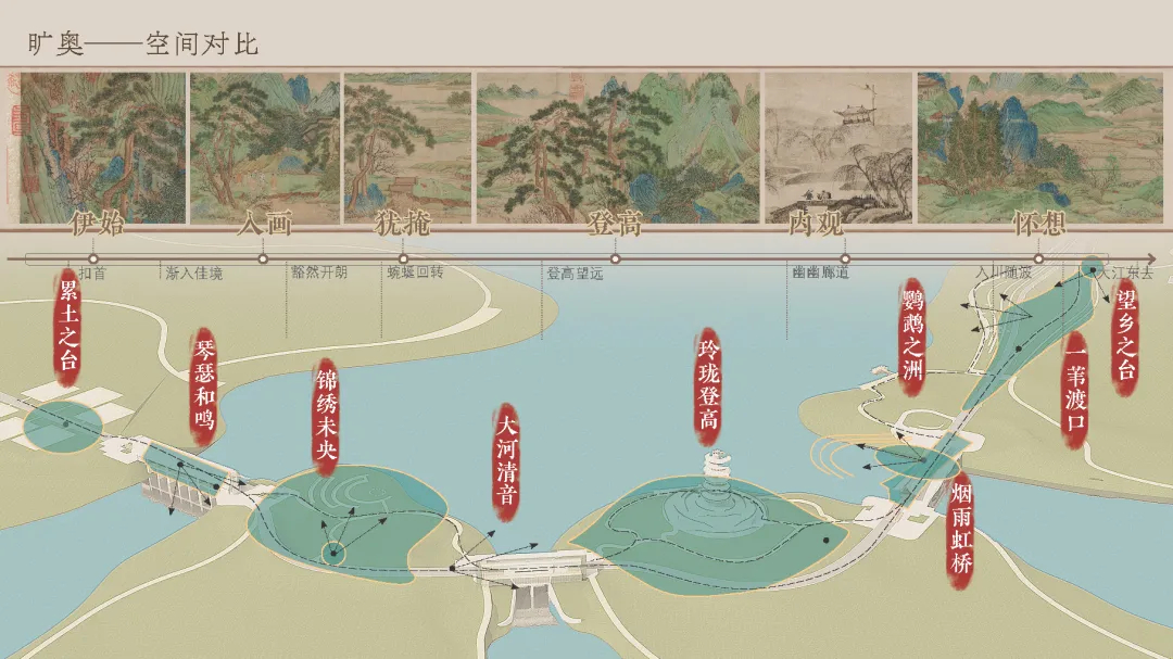 九個節(jié)點(diǎn),象征著人生的不同主題階段,將自然、至情、藝術(shù)、人文、美好、善良、真誠的寓意暗含其中。場景以大尺度土臺為空間伊始,以玲瓏登高為序列的高潮,以回望大河疏朗的望鄉(xiāng)之臺為收尾,各節(jié)點(diǎn)各具特色,空間開合有致,共同演繹這唯美至真的一首曲子、一幅畫卷、一襲美好華裳。