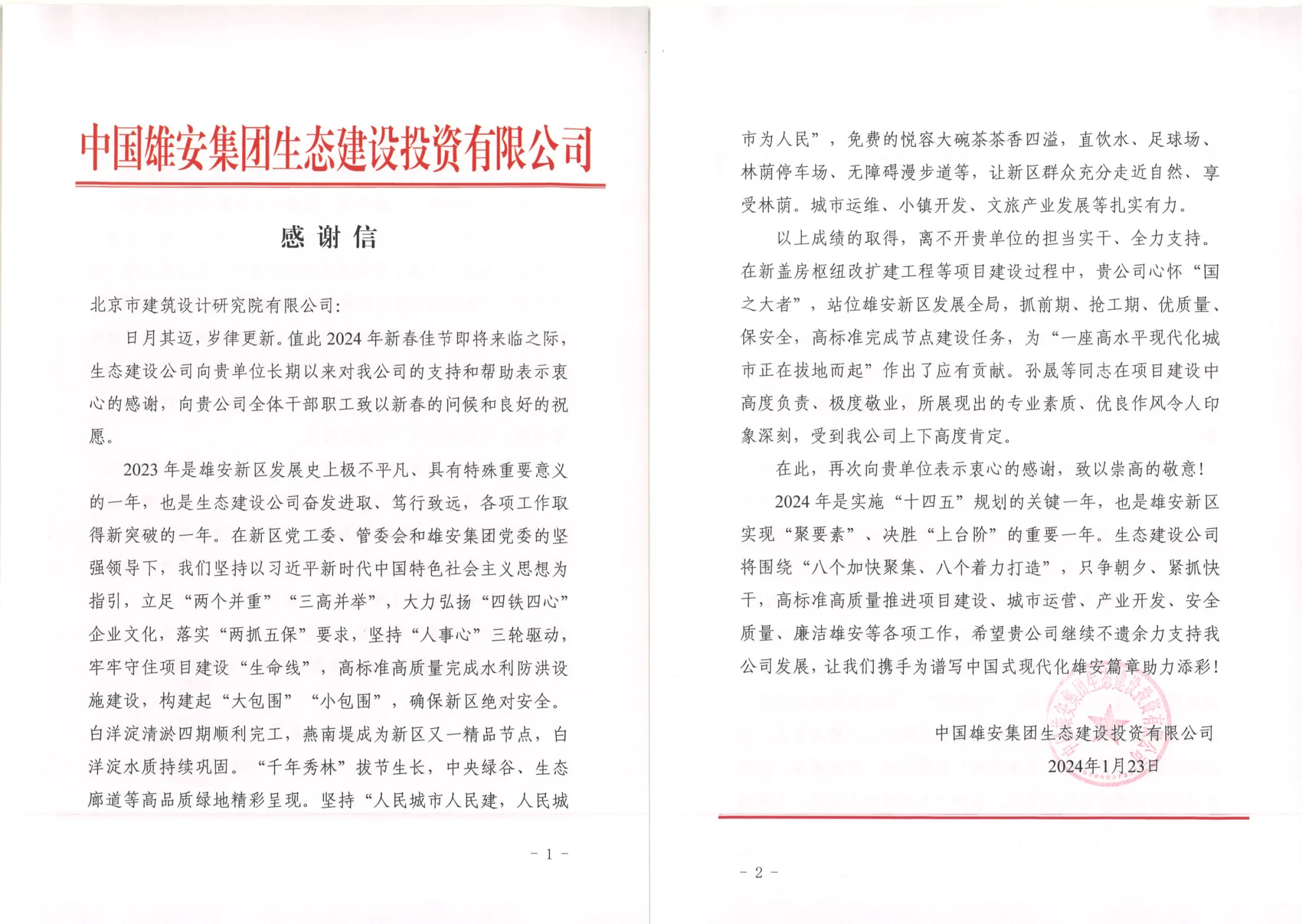 為譜寫中國式現(xiàn)代化雄安篇章助力添彩丨北京建院收到感謝信