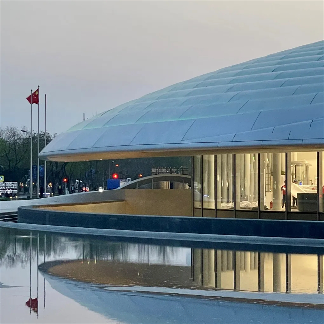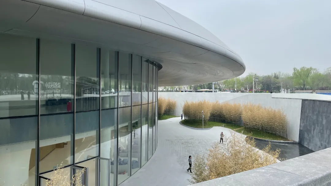 建筑造型充分考慮了“三山五園”地區(qū)自身的環(huán)境特點,用覆土建筑的方式大膽創(chuàng)造了無北立面的建筑,建筑伏于大地之上,由北向南緩緩舒展。遵從中國傳統(tǒng)建筑注重“天人合一”的思想,強調(diào)建筑與環(huán)境的有機融合,挑檐深遠而平緩。從不遠處的三山向會址方向遠眺,建筑體量消隱于城市中,綠色屋面以含蓄謙遜的姿態(tài)融入大環(huán)境中,也成為都市中難得的大地景觀。