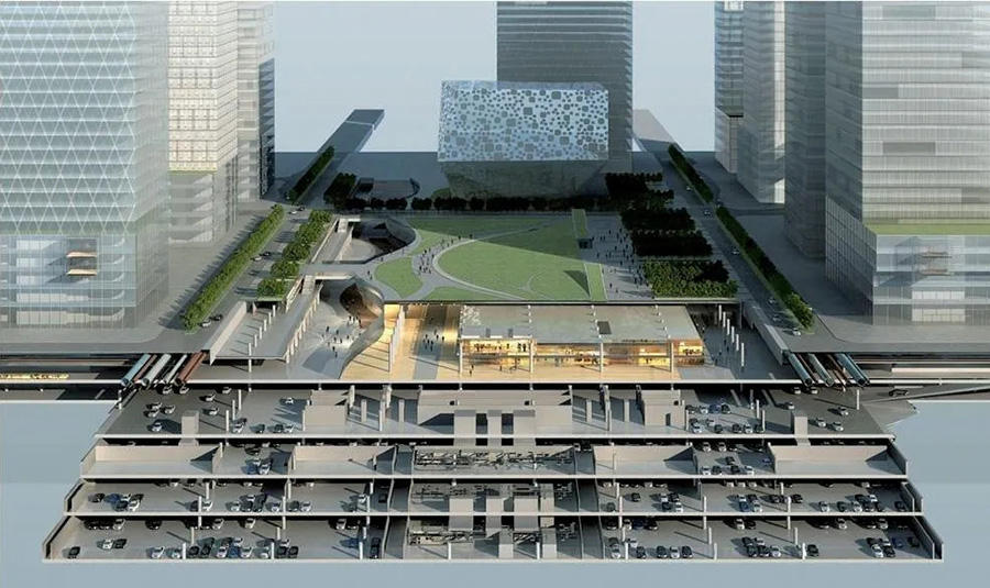 CBD核心區(qū)基礎(chǔ)設(shè)施工程位于中央公共綠地以及道路下方,是集交通、市政、景觀以及綜合防災(zāi)功能為一體的綜合設(shè)施,項目完工后將為區(qū)域提供宜人的地上空間、便捷的交通網(wǎng)絡(luò)和安全高效的市政基礎(chǔ)設(shè)施。本項目是特大型地下綜合工程,在設(shè)計中著重對道路空間的綜合開發(fā)與利用進(jìn)行了探討,道路結(jié)構(gòu)的設(shè)計打破了以往建筑和市政專業(yè)相互分裂的局面,全面整合了城市空間,具有很強(qiáng)的示范意義。