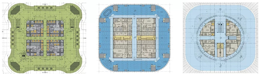 中信大廈的設(shè)計將現(xiàn)代科技與傳統(tǒng)文化相結(jié)合, 從中國傳統(tǒng)禮器“尊”的形體特征中汲取造型的靈感, 經(jīng)過抽象處理和比例優(yōu)化,形成高雅秀美的獨(dú)特造型。建筑方正舒朗、莊重恢弘,底部穩(wěn)重大氣,與結(jié)構(gòu)要求相得益彰, 從底向上逐漸收分, 提供合理舒適的辦公空間,頂部逐漸放大形成雙曲線造型。曲線的建筑造型不僅打破了常規(guī)高層建筑直線形態(tài), 建筑圓潤精巧的造型也有效減少了風(fēng)荷載對超高層建筑的影響。