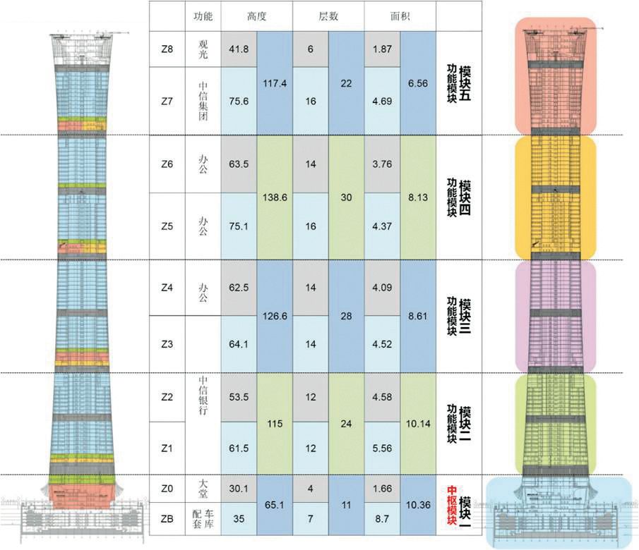 基于模塊劃分,在條件允許的情況下,所有系統(tǒng)應(yīng)按照模塊劃分的原則進(jìn)行設(shè)置。在設(shè)計中,首先基于模塊概念構(gòu)建關(guān)于建筑整體運(yùn)行的基礎(chǔ)性系統(tǒng),通過基礎(chǔ)性系統(tǒng)的建立保證每個模塊具有相對獨(dú)立的運(yùn)行和安全保障條件,每個模塊之間具有可靠的安全分隔,局部的突發(fā)事件的處理優(yōu)先被控制在模塊內(nèi)部解決。外框筒幾何控制系統(tǒng)為外框筒及二次鋼結(jié)構(gòu)的精確化定義和定位提供依據(jù)。