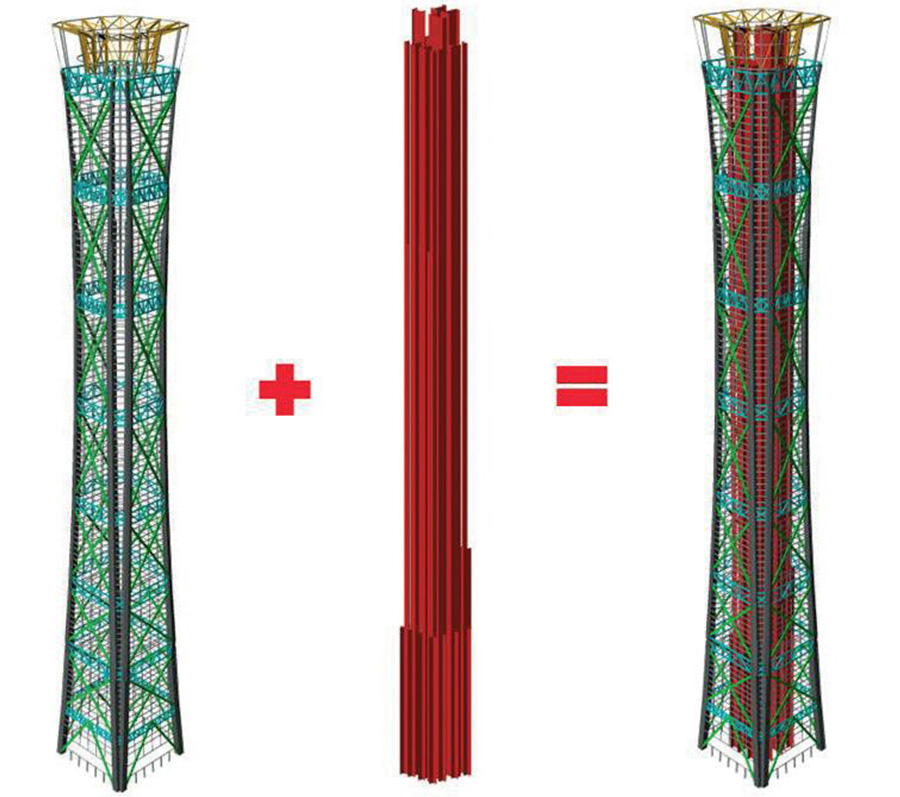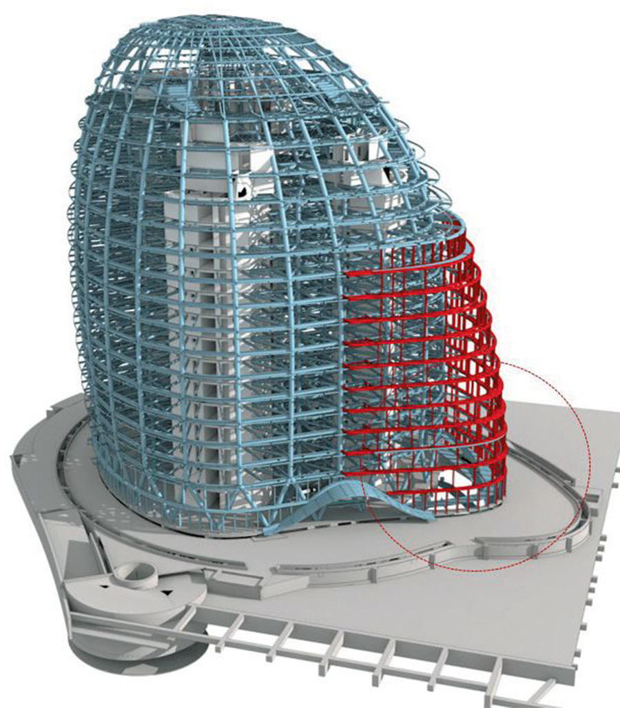 為降低結(jié)構(gòu)重心,建筑頂部30米造型巨構(gòu)外筒提前結(jié)束,由內(nèi)筒逐漸出挑支撐頂部空間造型,建筑外幕墻上只有幕墻的二次結(jié)構(gòu),大大提升建筑頂部的觀光條件。