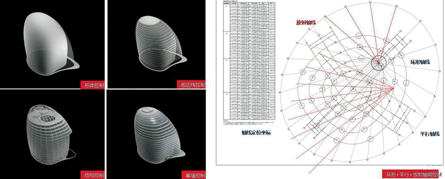 復(fù)雜建筑的關(guān)鍵在于三維幾何控制,通過邏輯清晰可描述的體系來進(jìn)行定義形體、板邊線、結(jié)構(gòu)柱軸線、幕墻基礎(chǔ)定位線等。本項目利用放射軸面和弧形平行軸面的組合軸網(wǎng)進(jìn)行整體控制,前者控制幕墻及外圍幕墻柱的形式一致,后者控制核心筒及功能平面,兩者相對獨(dú)立又相互關(guān)聯(lián),所有幾何元素都在軸網(wǎng)和控制體的基礎(chǔ)上通過計算得到。