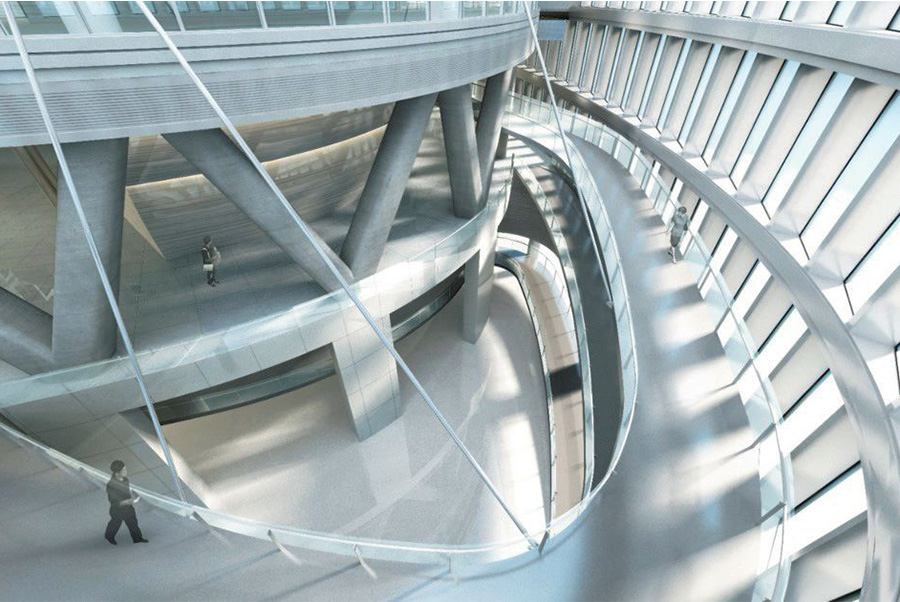 蛇形坡道從B1 環(huán)繞到二層,巧妙地與邊庭空間融合。通過蛇形坡道可以在建筑東南角12 層通高邊庭內(nèi)漫游,感受獨(dú)特的公共空間。