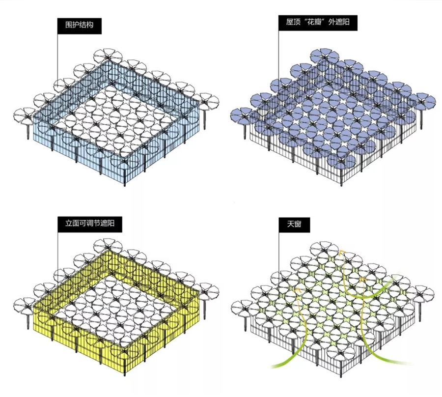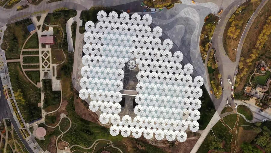 此外,設(shè)計團隊還為94把“花傘”賦予了綠色、科技、智慧的功能。比如,在“花傘”頂部鋪設(shè)了光伏膜,可以在白天通過太陽能蓄電,為建筑的夜間運行提供輔助供電;針對延慶地區(qū)冬季寒冷多降雪、易結(jié)冰的氣候特點,每把“花傘”的頂部設(shè)有融雪電纜;在花傘頂部設(shè)置了坡向圓心,并在花傘柱內(nèi)設(shè)置雨水管,使雨水得以回收利用。