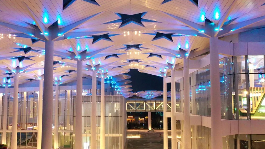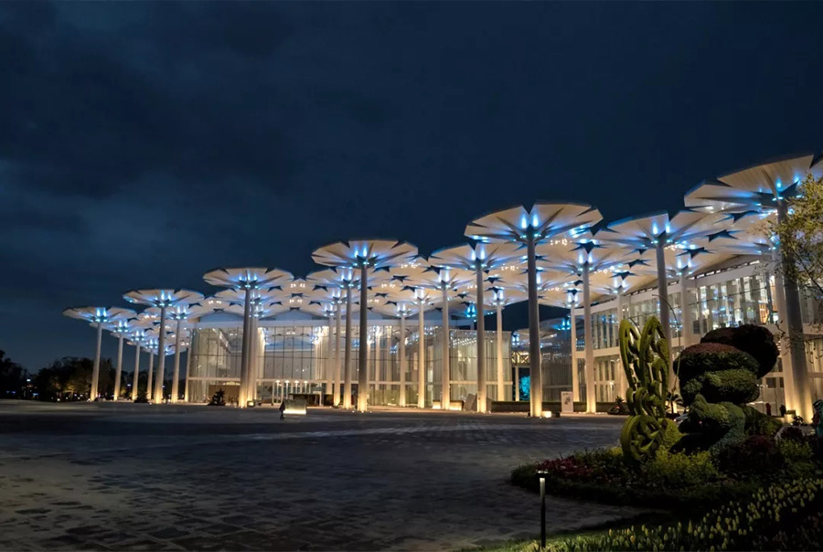 就像人在白天的工作和晚上的生活中會有不同,設(shè)計團隊希望國際館也有兩面,白天是冷靜典雅的一面,晚上是狂熱奪目的一面。為此,設(shè)計團隊在94朵“花傘”上,設(shè)置了約1000盞LED燈具,可以按照花朵、色塊和變化時長,進行不同維度的分組、組合,從而在晚上呈現(xiàn)出五彩繽紛的燈光效果。這種大膽的燈光設(shè)計方式,在世園會的展館中尚數(shù)首次。