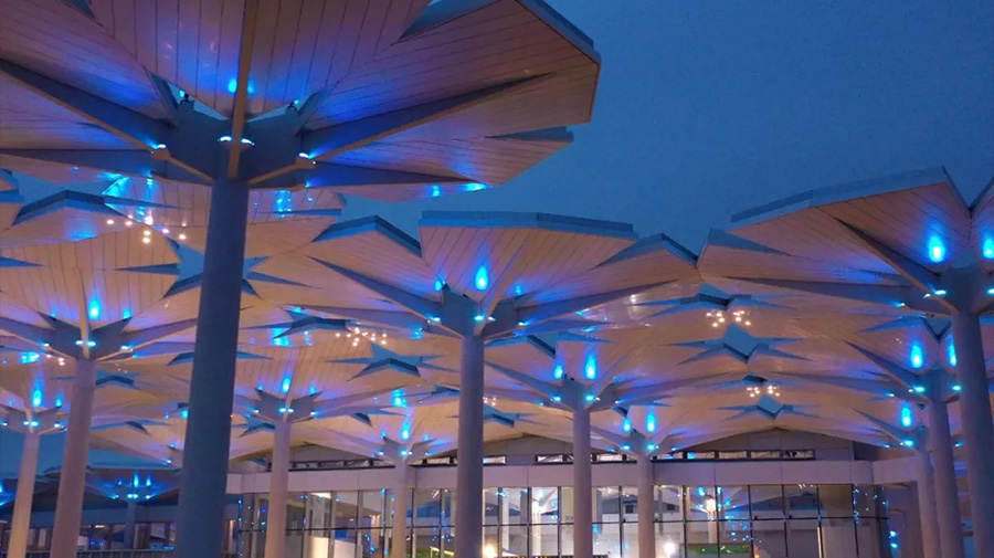 國際館館頂簇?fù)碇摹盎▊恪笔沁@次設(shè)計的最大亮點,由鋼柱和懸挑鋼梁構(gòu)成的“花傘”,在頂部的花瓣處互相連接,既對建筑起到支撐作用,又構(gòu)成了如同“花海”般的屋頂。