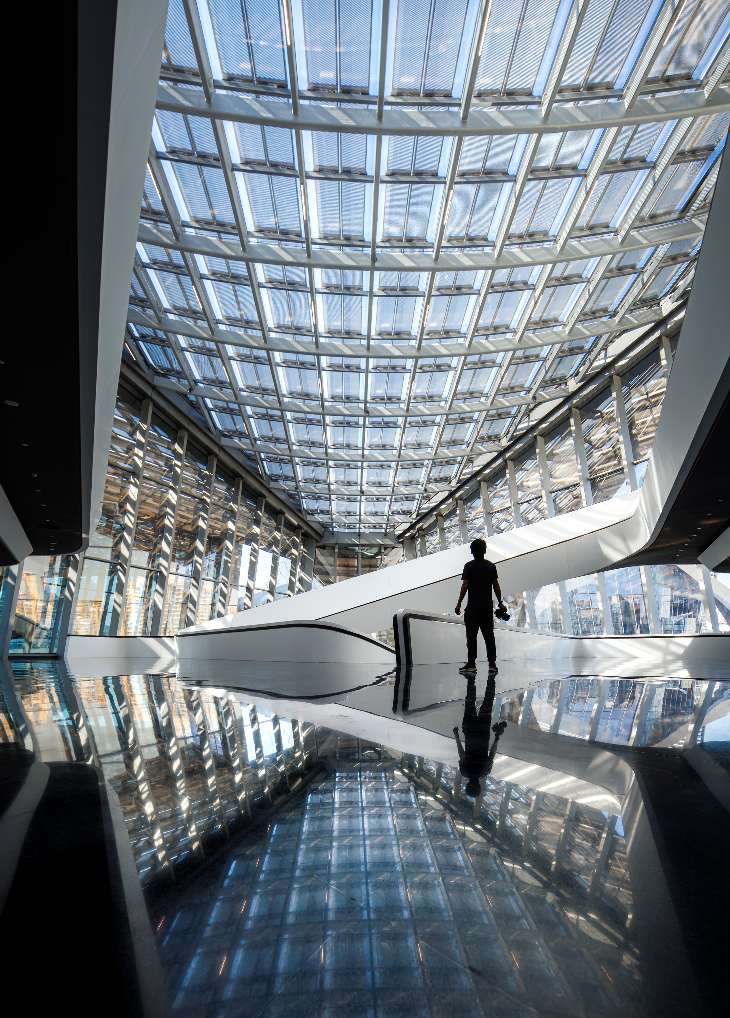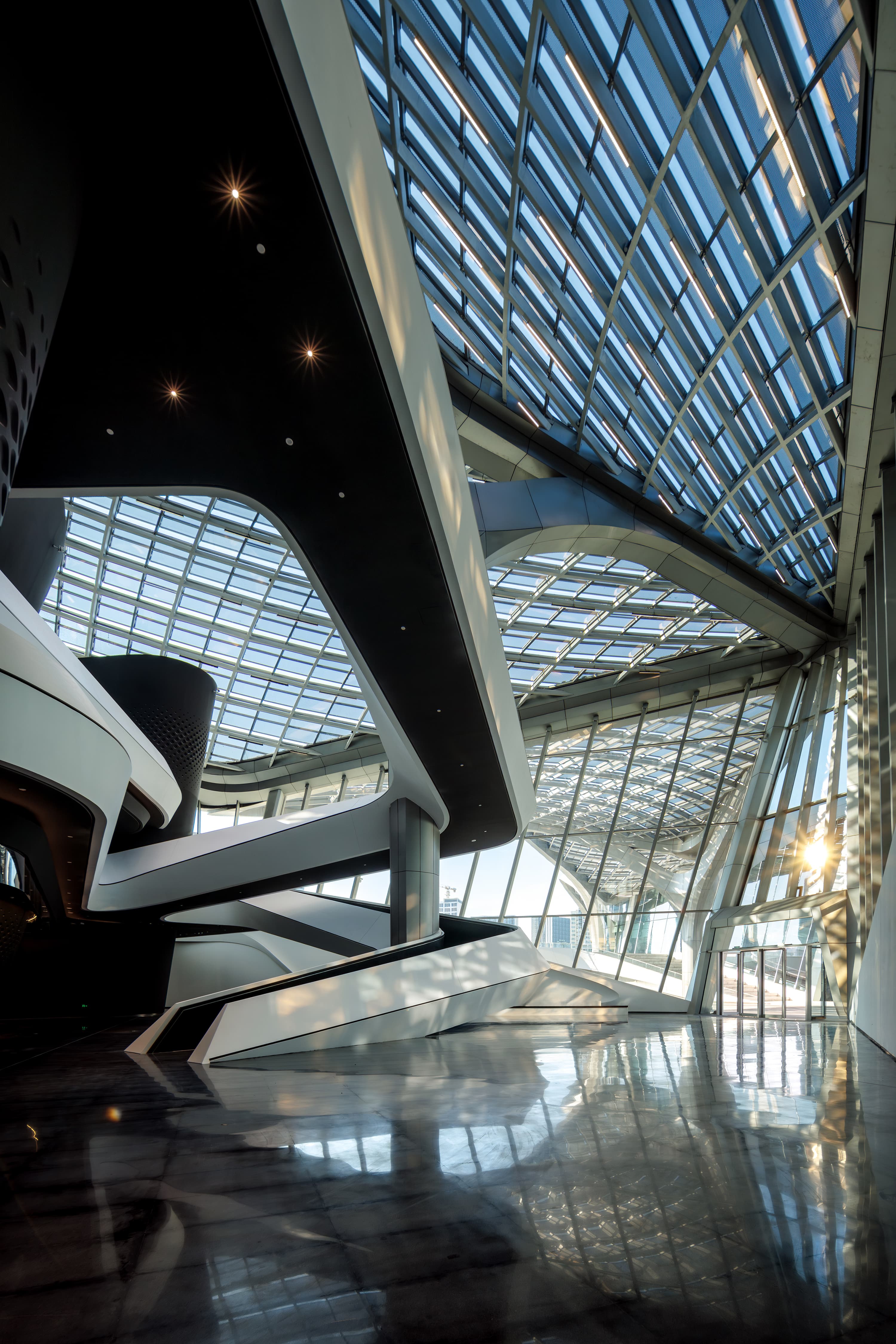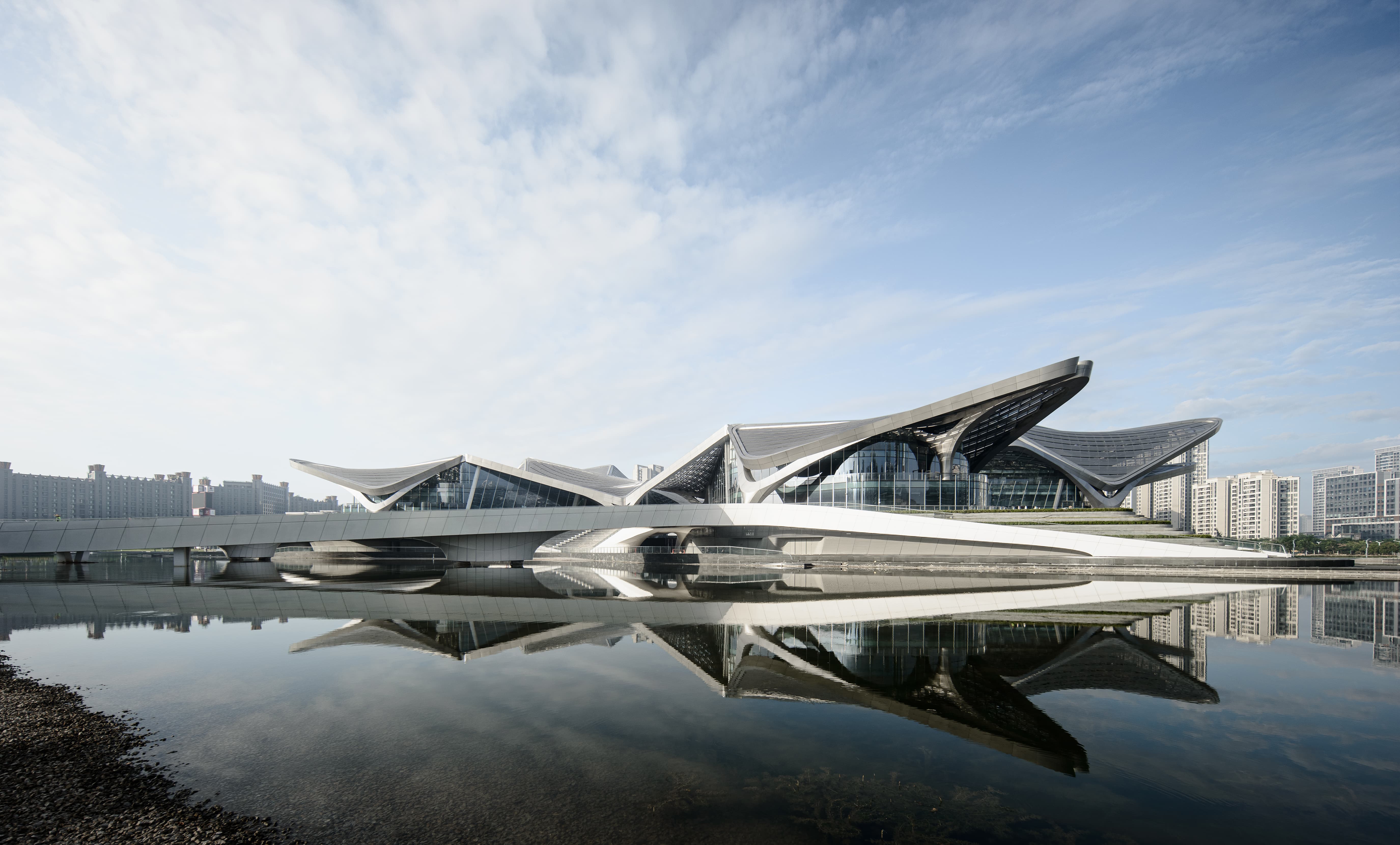 北京建院華南設(shè)計中心與Zaha Hadid Architects 共同完成的金灣航空城市民藝術(shù)中心設(shè)計靈感來源于成群的飛鳥以及漂流的風帆,由此塑造了具有震撼力的建筑輪廓,成為航空城中心中軸線上的新地標。標志性形象主要體現(xiàn)在屋面形態(tài),為了呼應(yīng)候鳥在編隊飛行時的“V”形圖案,每個場館都采用了重復(fù)、對稱且尺寸來回變化的曲面網(wǎng)殼為基本造型,形成了一個由相似元素構(gòu)成的組合,四部分錯落關(guān)系屋面的將大劇院、多功能廳、科普交流區(qū)及藝術(shù)展示區(qū)四大功能整合成一體,舒展飄逸、連續(xù)變化的羽翼狀建筑,與中心湖的濱水景觀交相輝映,形成一道靚麗的風景線。