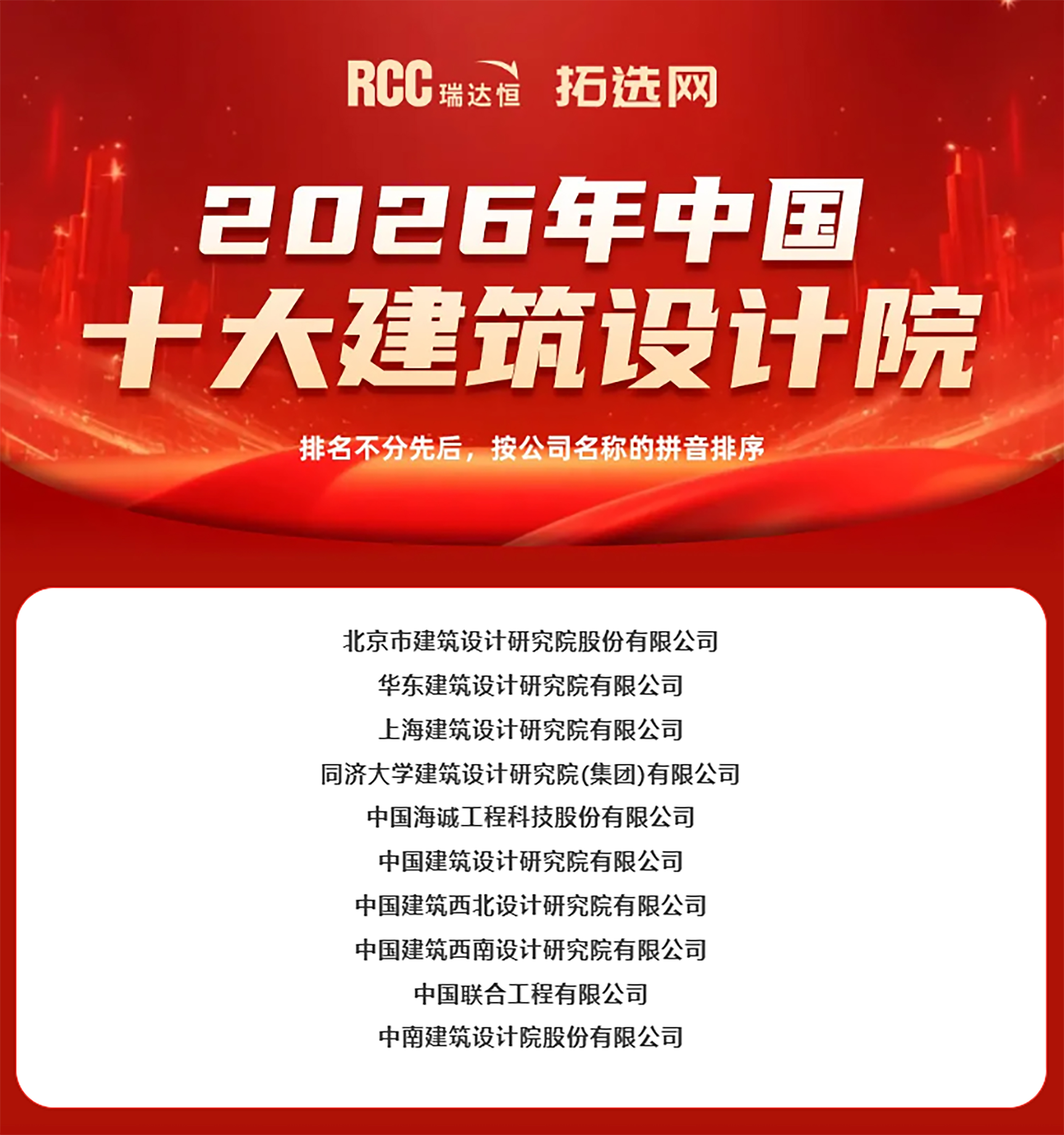 2026年建筑行業(yè)十大建筑設(shè)計(jì)公司榜單權(quán)威發(fā)布,該活動(dòng)由知名建筑行業(yè)咨詢(xún)公司RCC瑞達(dá)恒主辦,已連續(xù)舉辦16年。RCC瑞達(dá)恒系統(tǒng)性地監(jiān)測(cè)各大新聞媒體、中大型甲方單位、設(shè)計(jì)公司及施工單位網(wǎng)站以及各級(jí)政府的信息平臺(tái),并致電和拜訪(fǎng)了三百多萬(wàn)家開(kāi)發(fā)商、政府機(jī)關(guān)、設(shè)計(jì)公司、承建商和分包商的項(xiàng)目負(fù)責(zé)人,調(diào)研范圍覆蓋2025全年、超過(guò)42萬(wàn)個(gè)有效樓宇項(xiàng)目,項(xiàng)目總造價(jià)超過(guò)46萬(wàn)億元。RCC瑞達(dá)恒經(jīng)過(guò)系統(tǒng)和人工篩選后全年收錄的工程行業(yè)的招中標(biāo)公告達(dá)3740萬(wàn)條,其中包括2100萬(wàn)條中標(biāo)公告。以上述的大數(shù)據(jù)為依托,RCC瑞達(dá)恒測(cè)算出各企業(yè)所參與的項(xiàng)目和采購(gòu)的總價(jià)和規(guī)模,秉承客觀(guān)和公正的原則,評(píng)選出“中國(guó)十大承建單位、中國(guó)十大建筑設(shè)計(jì)公司、中國(guó)十大民營(yíng)、外資、室內(nèi)裝修設(shè)計(jì)公司”。