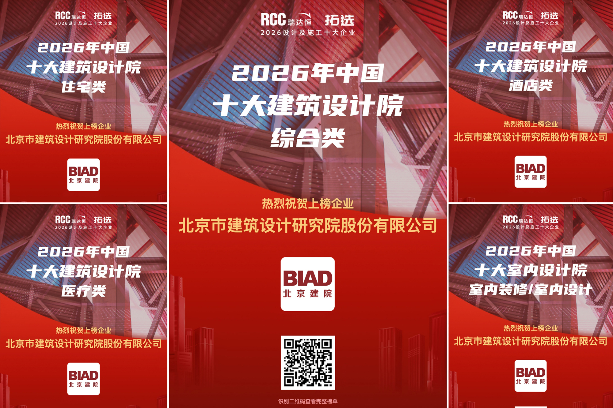 日前,2026年“中國(guó)建筑行業(yè)十大系列評(píng)選”榜單權(quán)威發(fā)布。北京市建筑設(shè)計(jì)研究院股份有限公司榮登“2026中國(guó)十大建筑設(shè)計(jì)公司”綜合類(lèi)榜單,同時(shí)入選四大類(lèi)別細(xì)分領(lǐng)域榜單(酒店類(lèi)、醫(yī)療類(lèi)、住宅類(lèi)、室內(nèi)裝修/室內(nèi)設(shè)計(jì))。