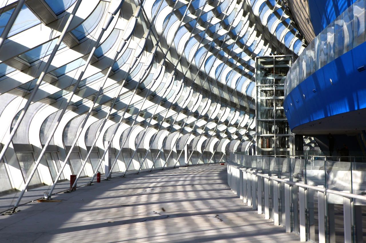 大道速滑是在400米長的橢圓冰道上對抗速度的競賽,速度是立面設(shè)計的主題。運動員一圈圈地飛馳而過,冰刀在冰面上留下晶瑩閃亮的刻痕?!氨懂嫷娜Γζ鹆苏l改變?!边@些線條是速度的印跡,沿橢圓輪廓上升、彎曲、內(nèi)外交錯而成“冰絲帶”的立面。