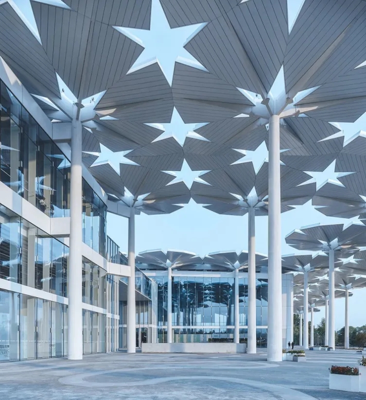 尤為值得一提的是,此次展區(qū)設(shè)計(jì)取意于2021年市優(yōu)公共建筑綜合獎(jiǎng)一等獎(jiǎng)獲獎(jiǎng)項(xiàng)目:2019年中國(guó)北京世界園藝博覽會(huì)國(guó)際館,將“花傘”作為主題元素。2019年中國(guó)北京世界園藝博覽會(huì)國(guó)際館由北京建院設(shè)計(jì),坐落在北京西北延慶區(qū)的媯水河畔,地上二層,地下一層,總建筑面積為22,000平方米。項(xiàng)目創(chuàng)新應(yīng)用數(shù)字化設(shè)計(jì)方法與綠色建筑技術(shù)于一體,實(shí)現(xiàn)高度和坡度均不相同94朵花傘的數(shù)字化設(shè)計(jì)與建造,不僅為設(shè)計(jì)過(guò)程提供完整技術(shù)平臺(tái),而且極大的提高從方案設(shè)計(jì)到施工全過(guò)程的數(shù)字化控制精度,同時(shí)結(jié)合花瓣形態(tài)的花傘一體化結(jié)構(gòu)單元,將雨水回收、太陽(yáng)能光伏發(fā)電、蒸發(fā)冷卻降溫、自然采光、遮陽(yáng)等眾多綠色技術(shù)集于一體,極大的推動(dòng)建筑數(shù)字化設(shè)計(jì)、控制及建造等全系統(tǒng)聯(lián)動(dòng),結(jié)合綠色建筑技術(shù)的應(yīng)用,對(duì)倡導(dǎo)建筑行業(yè)的可持續(xù)發(fā)展理念,積極引導(dǎo)大力發(fā)展綠色建筑,建設(shè)資源節(jié)約和環(huán)境友好型社會(huì),促進(jìn)節(jié)能省地型建筑的發(fā)展,具有十分重要的意義。