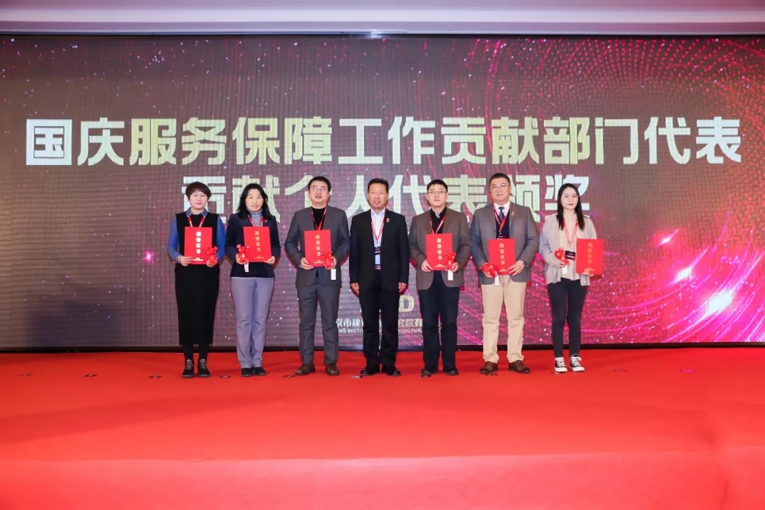 北京建院國(guó)慶群眾游行活動(dòng)、國(guó)慶服務(wù)保障工作、大興國(guó)際機(jī)場(chǎng)項(xiàng)目貢獻(xiàn)獎(jiǎng)獲獎(jiǎng)部門代表領(lǐng)獎(jiǎng)